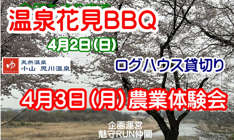 好評いただいた温泉花見BBQ、 第3回目開催いたします。 ふるってご参加ください。 4月2日(日) 会費:4, …